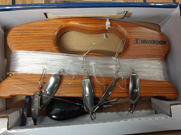 Utrustad med sex blänken 250 grams sänke och 50 meter stark 0,80 mm lina.